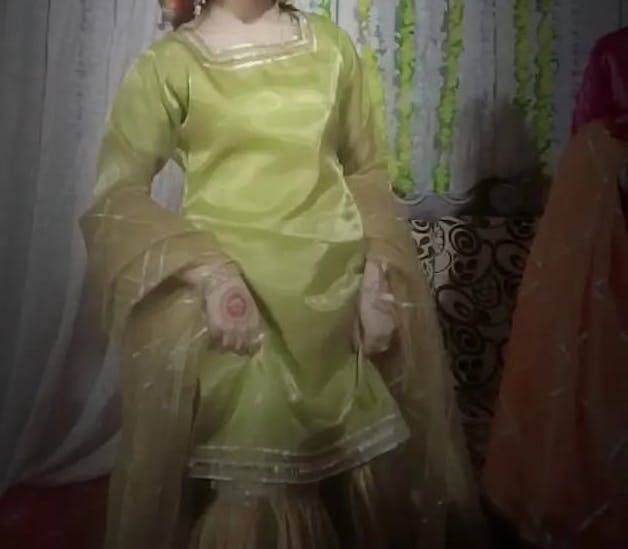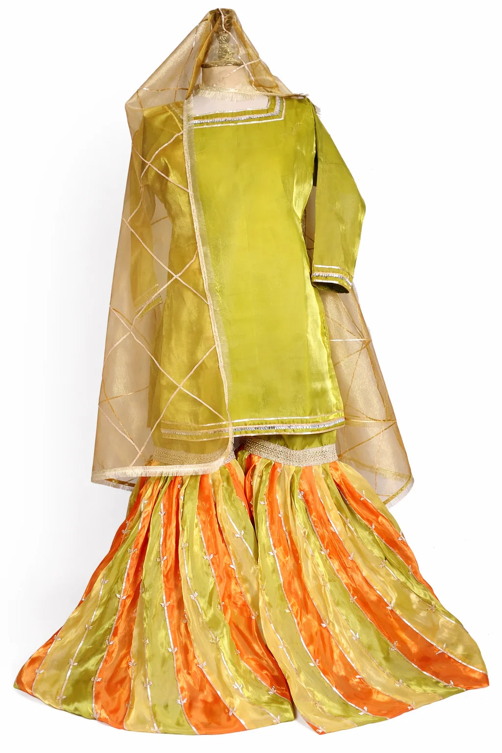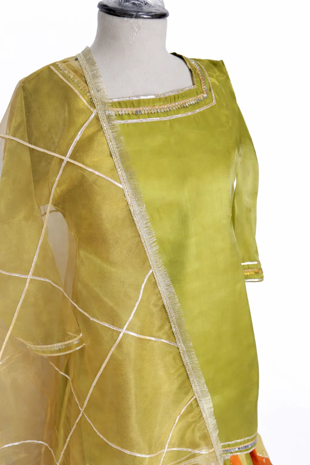 This stunning gharara and kurti set is a true eye-catcher, blending vibrant colors with traditional artistry. The mehandi-colored kurti features delicate lace-work along the neckline and hem, complemented by full sleeves finished with matching lace borders. The ensemble is paired with a striking gharara crafted in Chatta Patti style and accented with fine Gota (gotti) work. The look is perfectly balanced by a same mehandi dupatta featuring a unique checked border design.